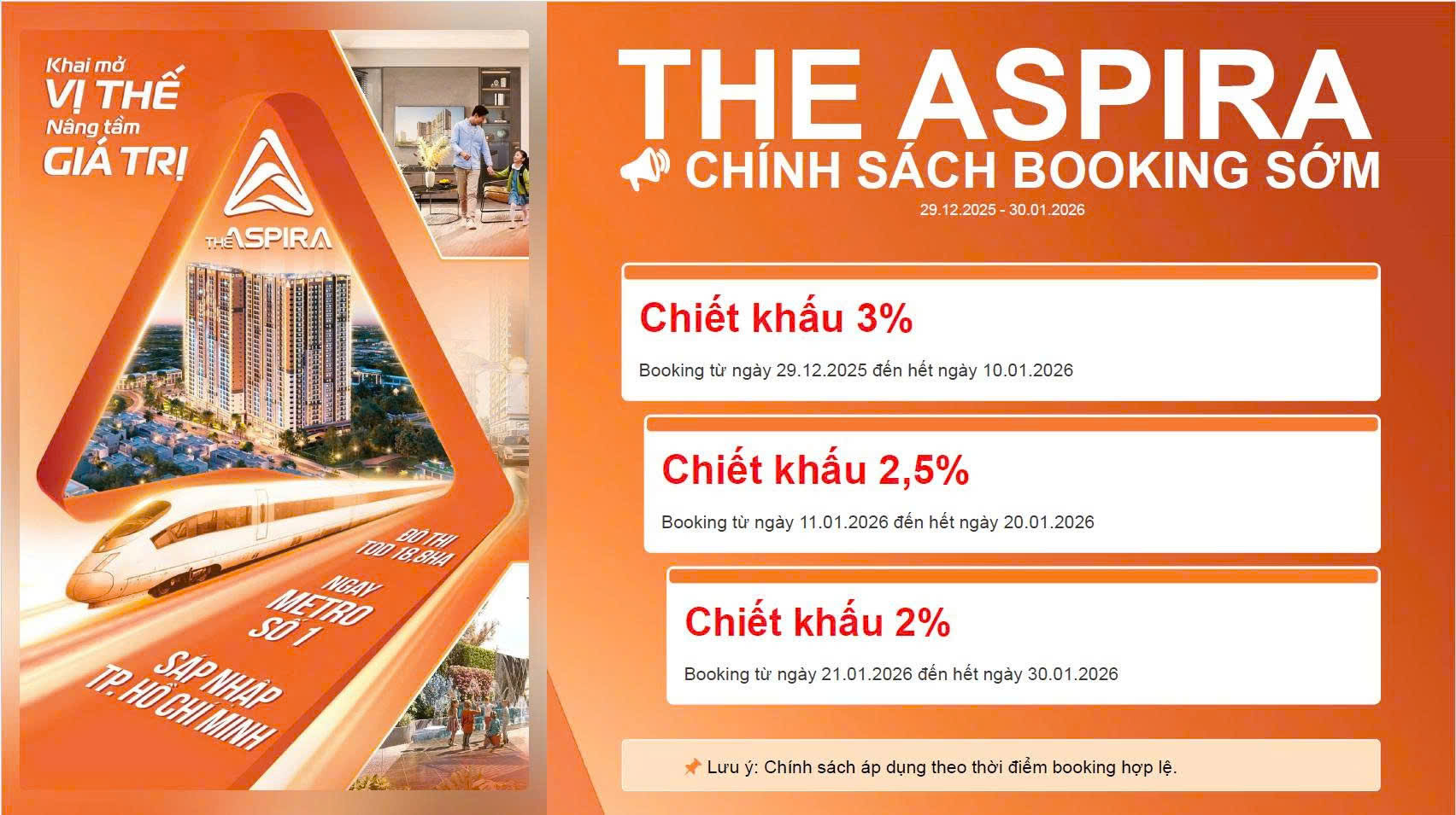 Ngày 29.12.2025, chương trình Chính sách ưu đãi Booking Tháng 1 đã được chủ đầu tư tung ra cho khách hàng quan tâm đến dự án The Aspira.