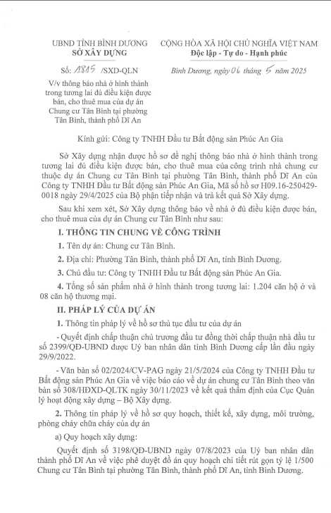 Theo Văn bản số 1815/SXD-QLN do Sở Xây dựng tỉnh Bình Dương cấp ngày 06/05/2025, dự án The Aspira đã chính thức đủ điều kiện được bán, cho thuê mua.