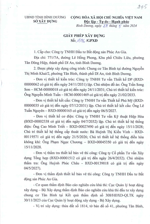• Giấy phép xây dựng: Dự án được cấp Giấy phép xây dựng số 1576/GPXD ngày 27/05/2024 bởi Sở Xây dựng tỉnh Bình Dương.