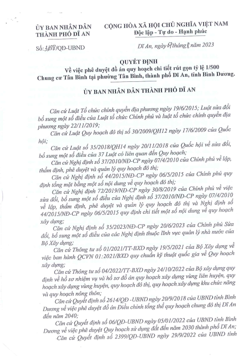 • Quy hoạch chi tiết 1/500: Đồ án quy hoạch chi tiết rút gọn tỷ lệ 1/500 đã được UBND Thành phố Dĩ An phê duyệt tại Quyết định số 3198/QĐ-UBND. Điều này đảm bảo dự án được xây dựng đồng bộ về hạ tầng, mật độ xây dựng và tiện ích đúng như cam kết.