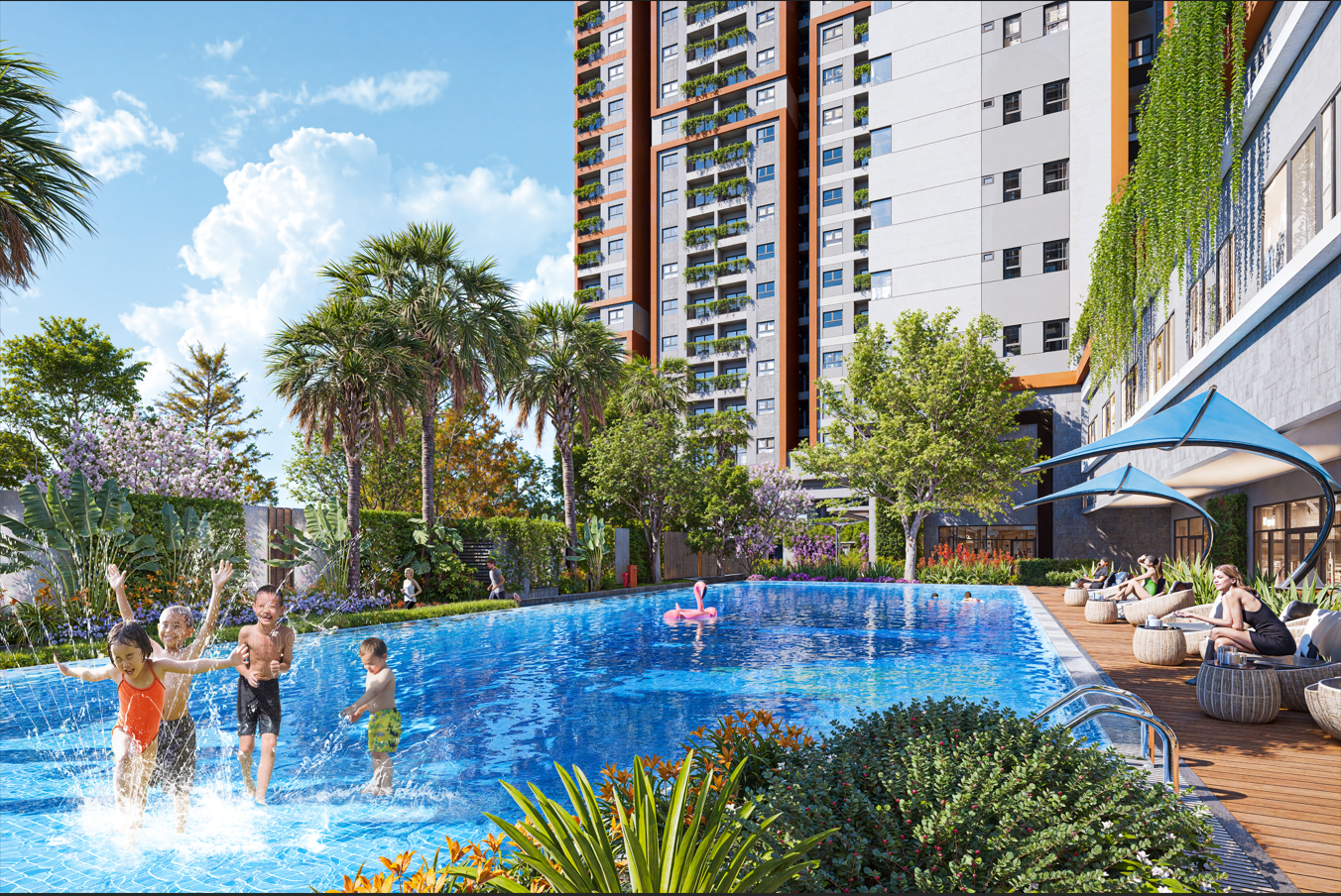 Khu hồ bơi Aspira dành cho người lớn và trẻ em có diện tích 300m2. Dành cho cư dân cuối tuần cùng con em xuống tận hưởng cảm giác mát mẻ và năng lượng