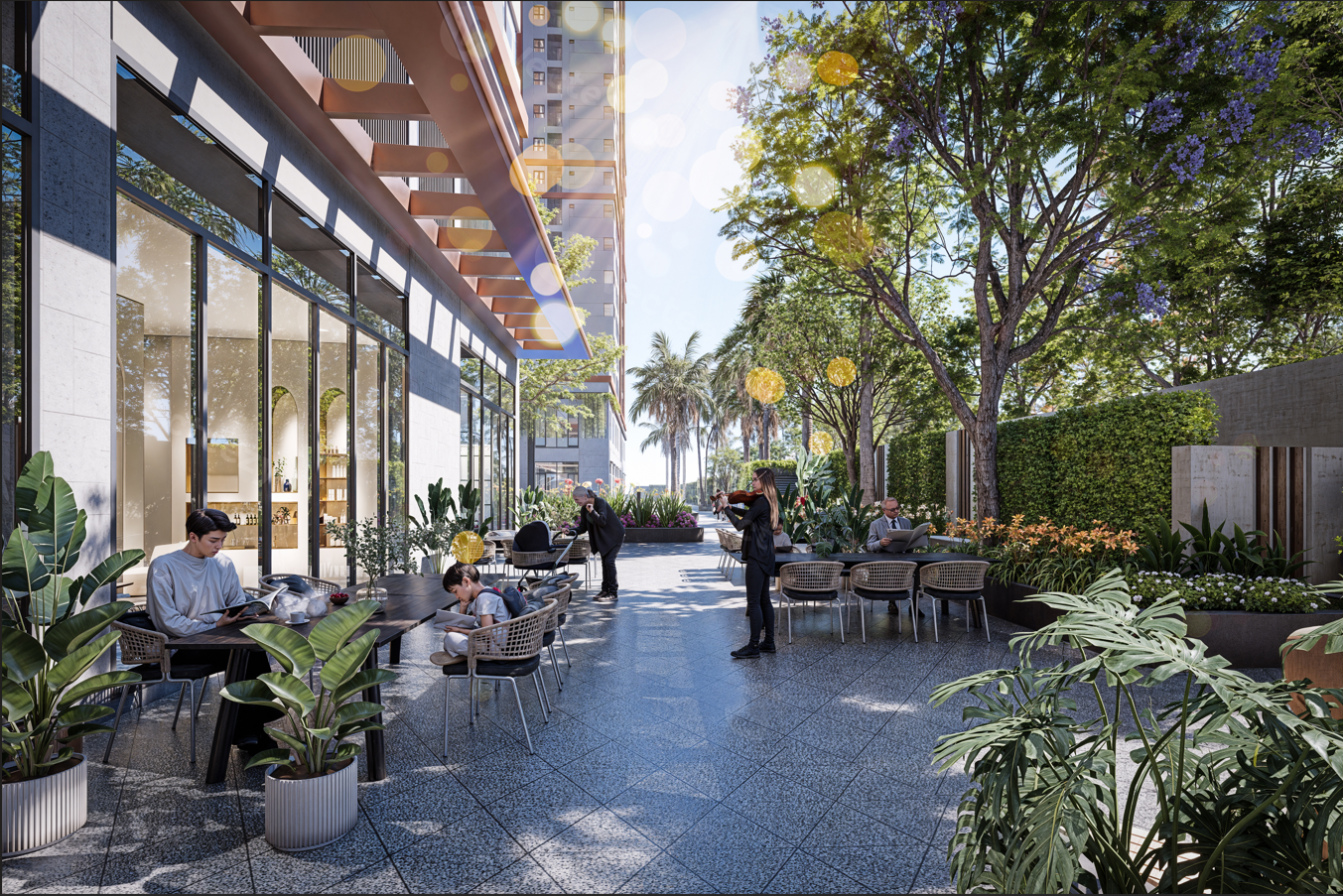 Đây có thể là tụ điểm được yêu thích nhất của cư dân. Nơi có thể thưởng thức cà phê sáng và cũng là nơi dừng chân nghỉ ngơi, làm việc.