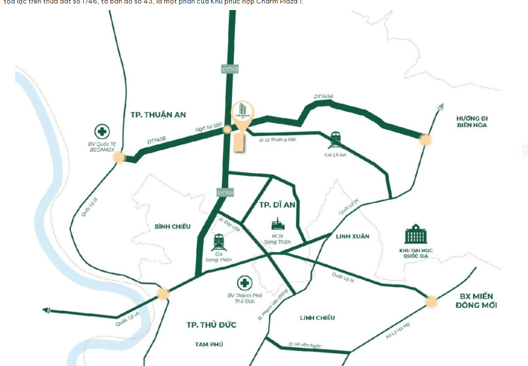- Tọa độ: Nằm trên đường Nguyễn Thị Minh Khai, kết nối trực tiếp ra đường DT743 và Mỹ Phước – Tân Vạn