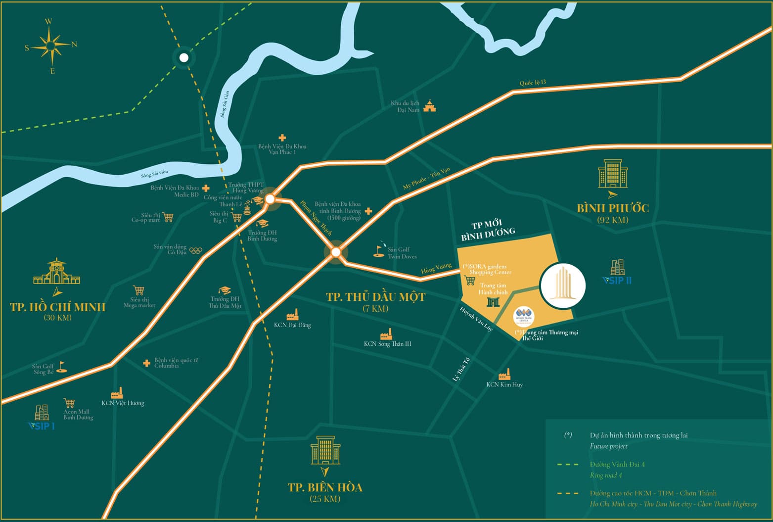 - 5 phút: Trung tâm hành chính tỉnh Bình Dương, Trung tâm thương mại Sora Gardens SC (có AEON Mall), khu ẩm thực Hikari