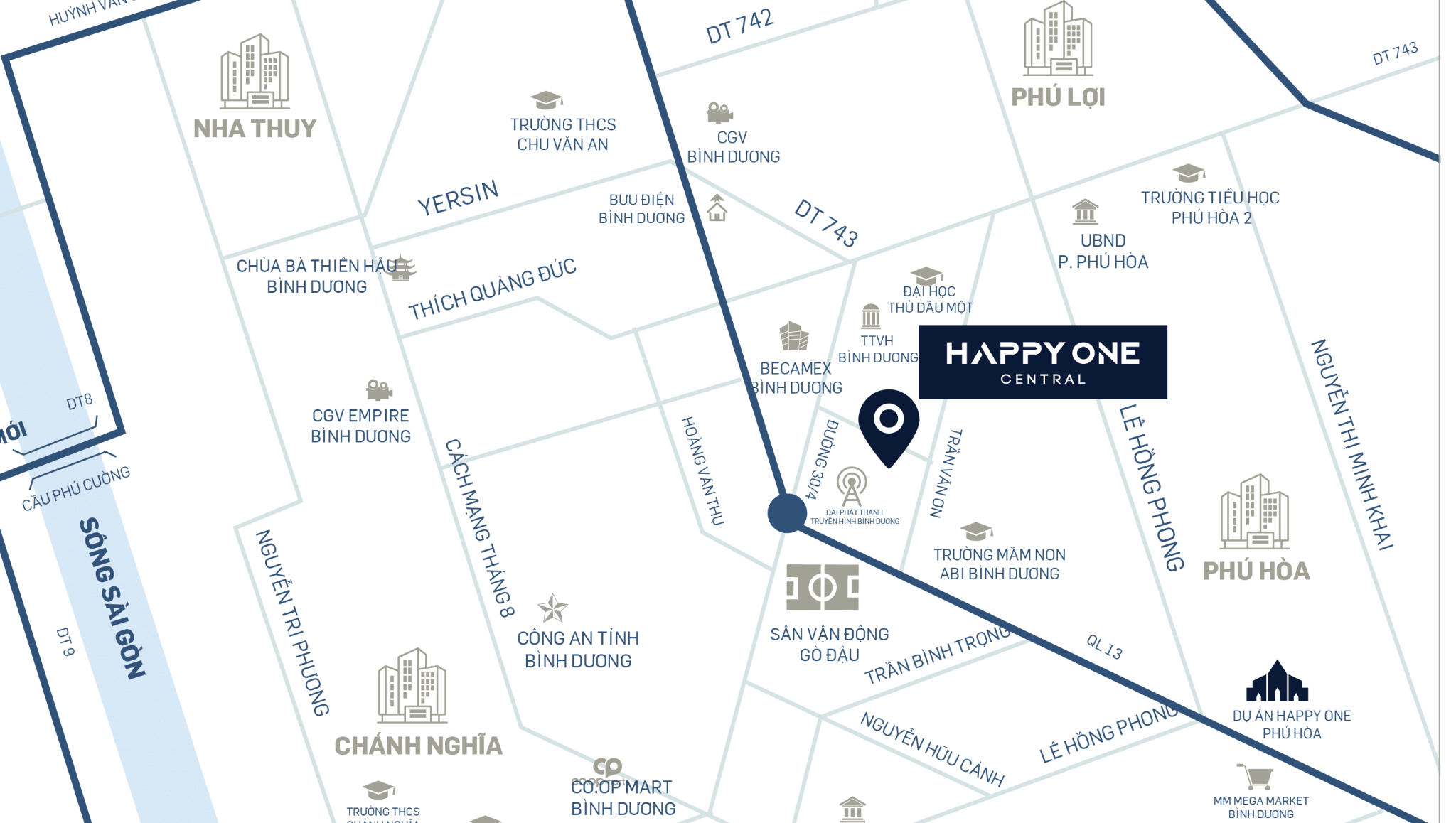 - 5 phút: Đến Đại học Thủ Dầu Một, siêu thị Co.op Mart, bến xe Bình Dương